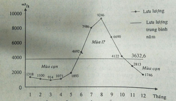 – Mùa lũ từ tháng 6 đến tháng 10, kéo dài 5 thángg. Tổng lưu lượng mùa lũ khoảng 32.736m^3/s, chiếm 75% lưu lượng dòng chảy cả năm. Lưu lượng thảng cao nhất gấp 2,24 lần tháng thấp nhất.